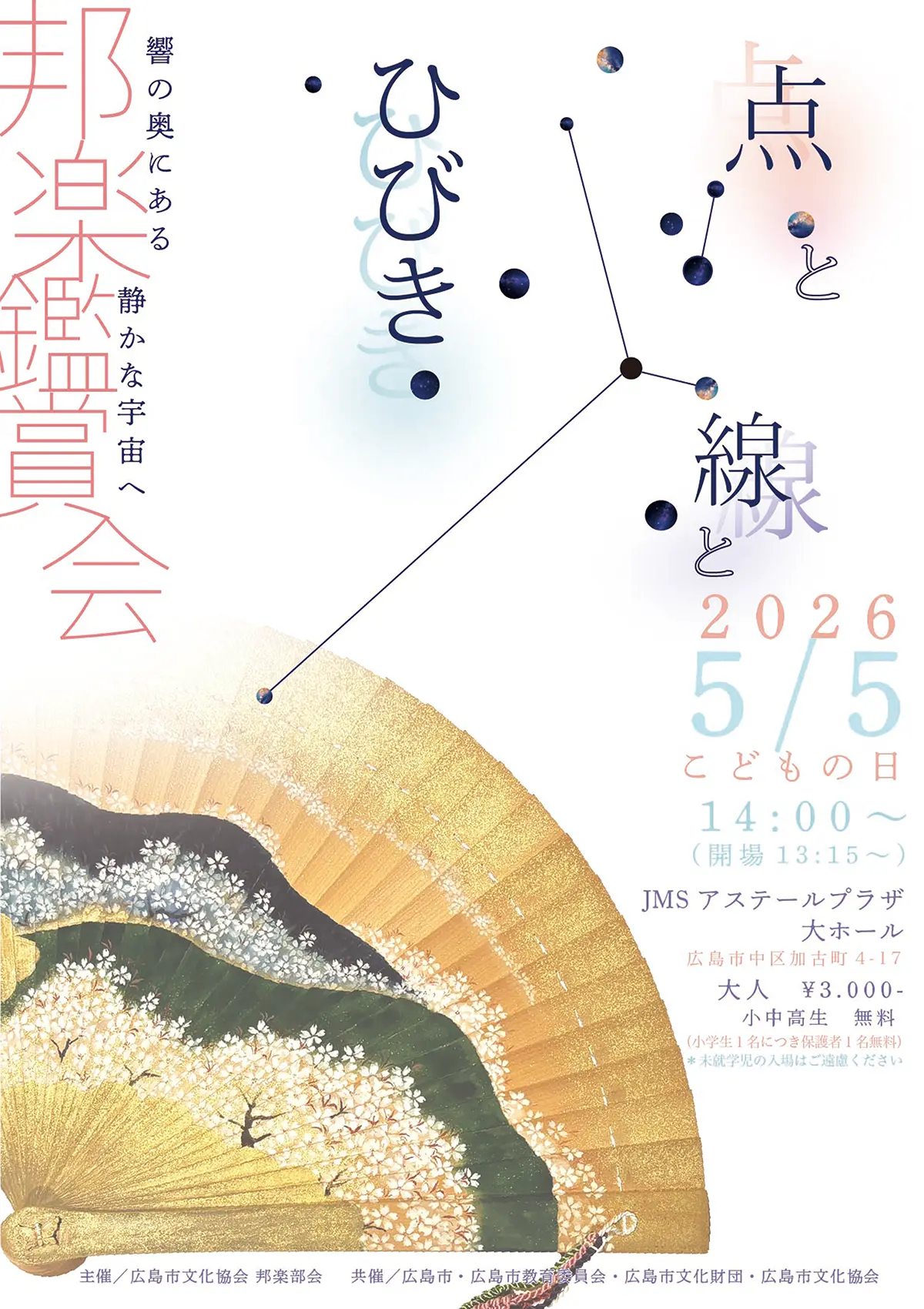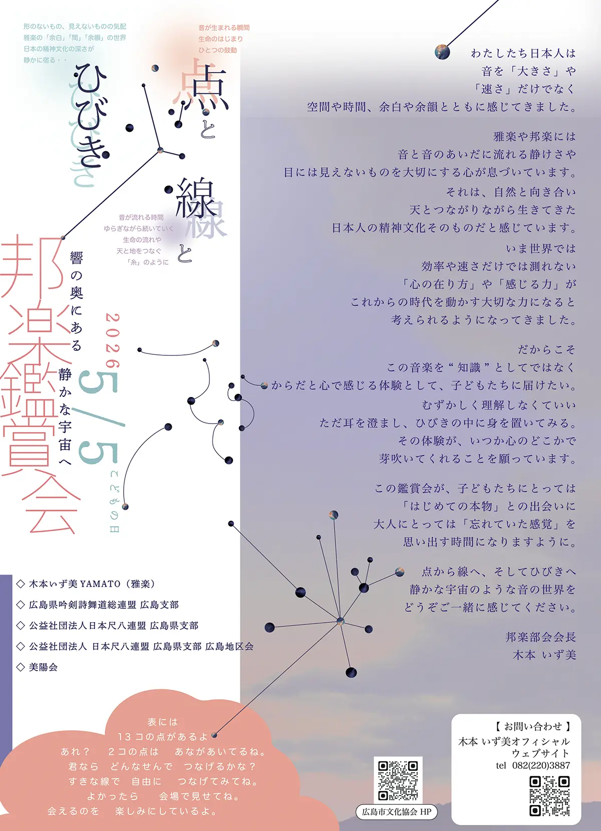 1200年以上前から伝わる雅楽の世界最古の名曲「越天楽」や近代箏曲「六段の調」をはじめとする、日本が誇る邦楽の至宝の数々を次世代を担う青少年に届けるための邦楽鑑賞会を開催します。